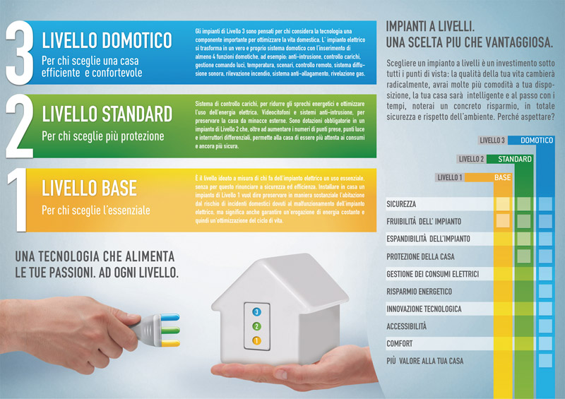 L’impostazione “a livelli” degli impianti è espressione di quella flessibilità funzionale e prestazionale che oggi richiede un edificio evoluto, integrando esigenze riconosciute, come, ad esempio, il comfort abitativo con la ricerca della massima sicurezza.